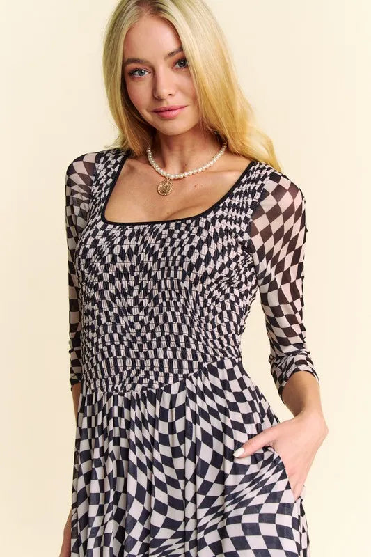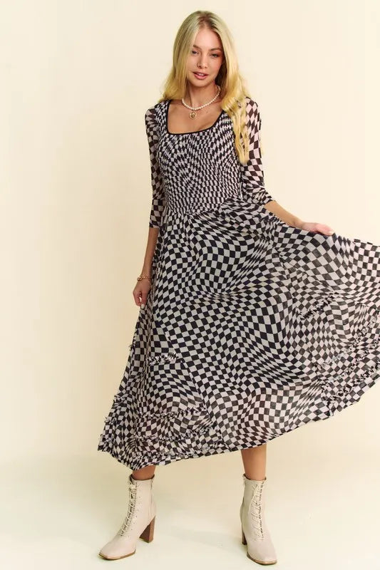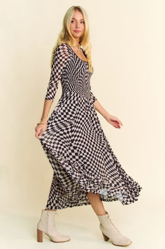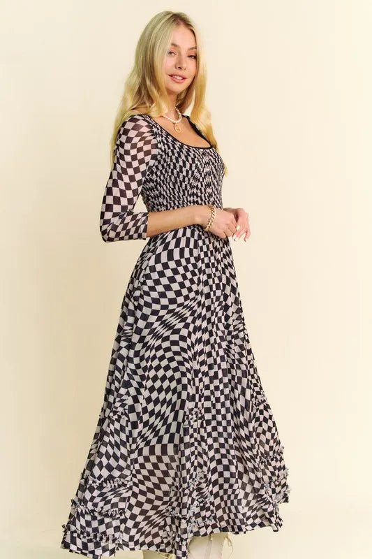 Davi & Dani Printed Checker Mesh Flowy Maxi Dress