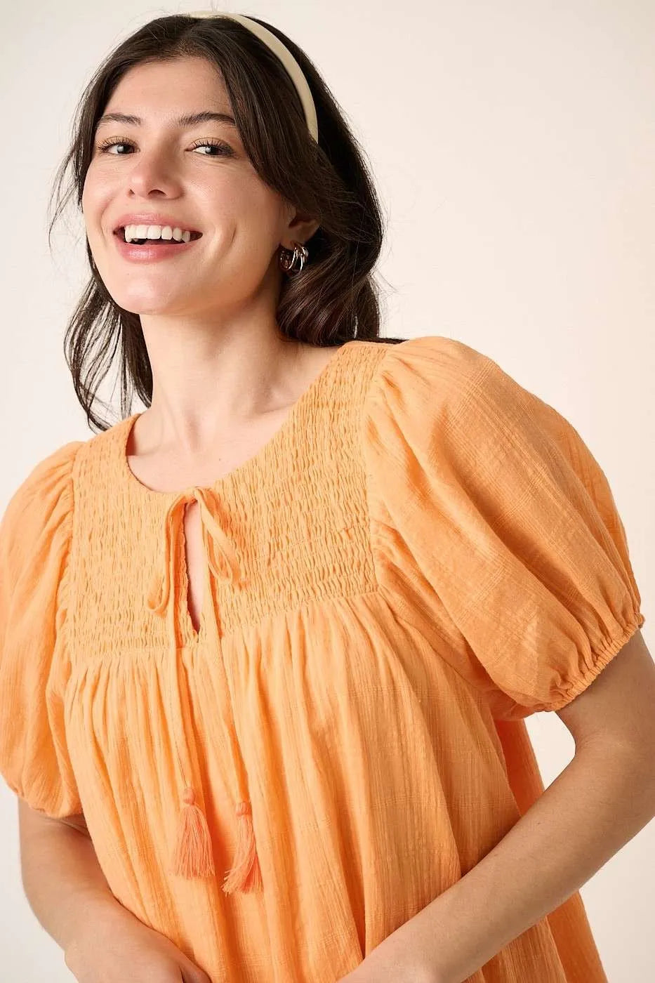 The Tassel Tie Plaid Gauze Short Sleeve Mini Dress is a fashionable and breezy piece that combines a classic plaid pattern with delicate gauze fabric and playful tassel ties. The short sleeves and mini length create a cute and casual look, perfect for warm weather days. The tassel ties add a fun and bohemian touch, adding a whimsical detail to the dress. Pair this mini dress with sandals or sneakers for a relaxed and stylish outfit that is perfect for a day out or a summer gathering.