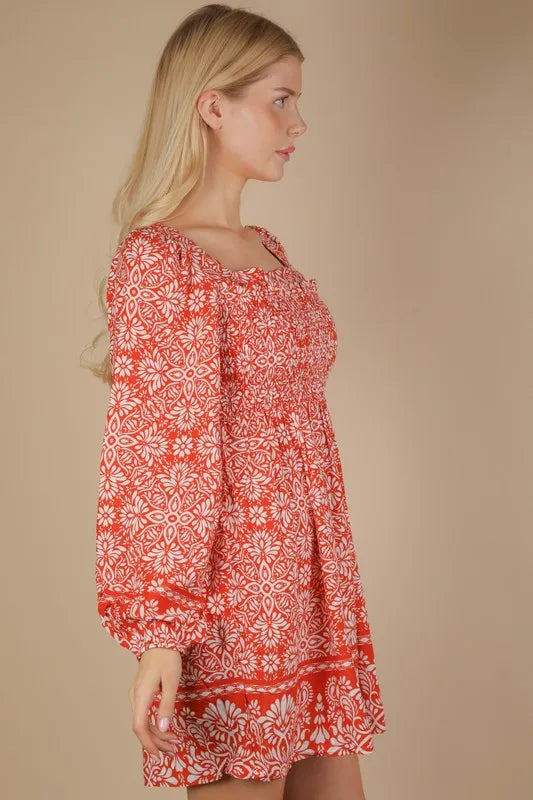 VERY J Printed Smocked Chest Boho Mini Dress
